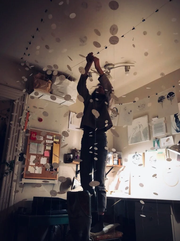 This is the original piece of art before it was cut into small circles for the hanging drifting mobiles. White Post marker, and pencil on vellum.